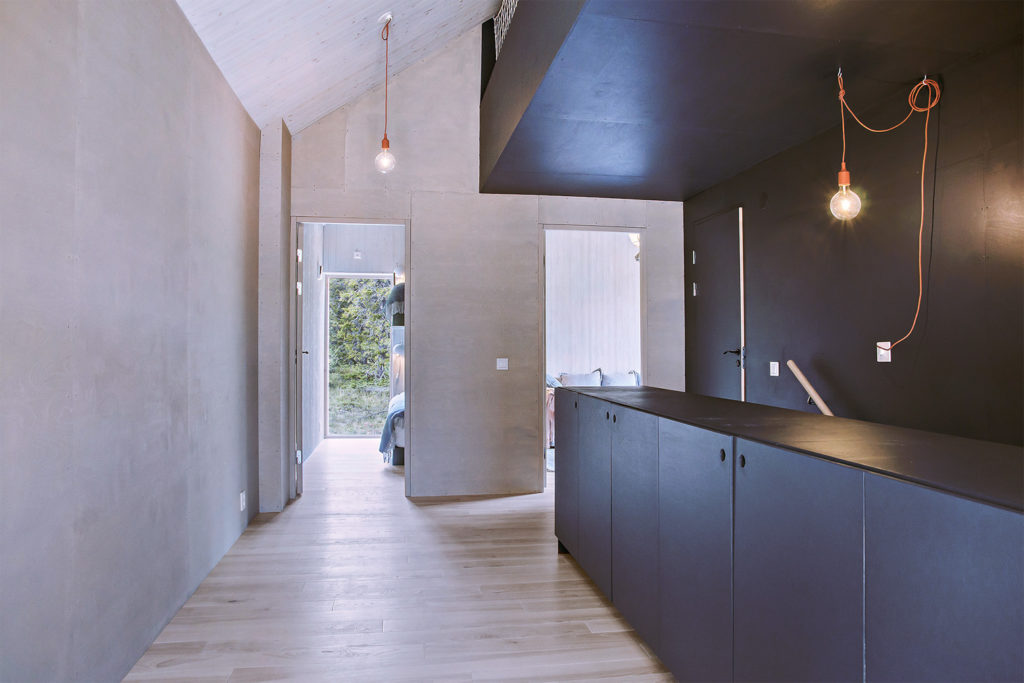 The main living space is a ‘house inside a house’ with a double-height kitchen and living room that follows the contour of the roof. Rectangular picture windows look out across the valley below.