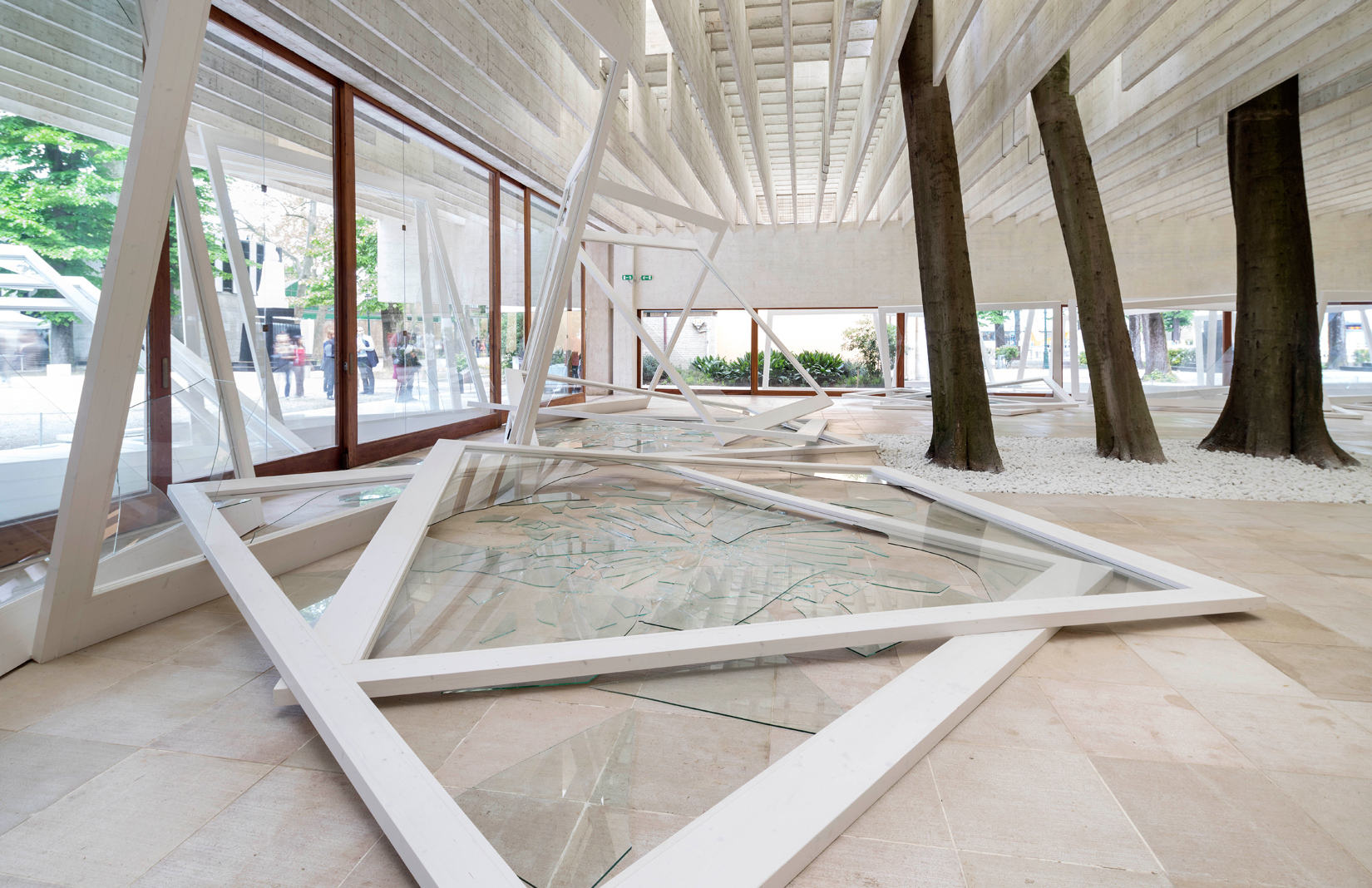 Like Zobernig, Norway’s Camille Norment works with a largely voided space, this time permeated by sound. Rapture includes a sculptural component – massive window frames lean precariously, their panes of glass splintered around the pavilion’s thresholds – as well as a ‘sonic intervention’. Conical speakers fanning from the modernist rafters play a hive-like instrument, bringing together sound and space.