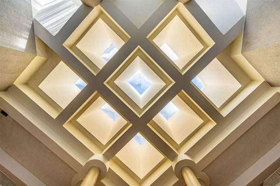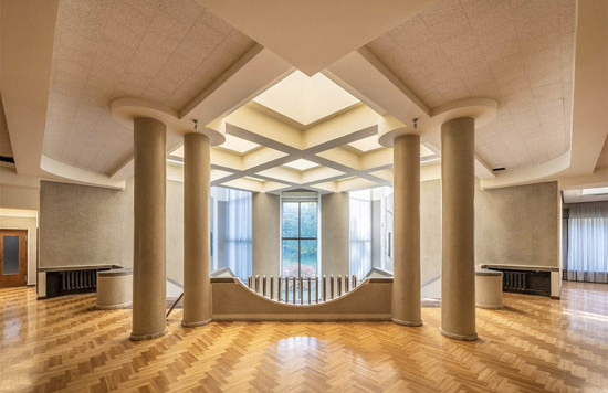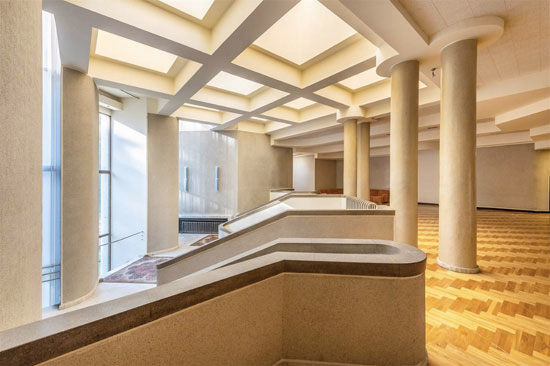 The 3,781 sqm Vilnius property was designed by Algimantas Alekna and its original details are still in place across the interiors – including coffered ceilings, patterned carpets, and parquet flooring.