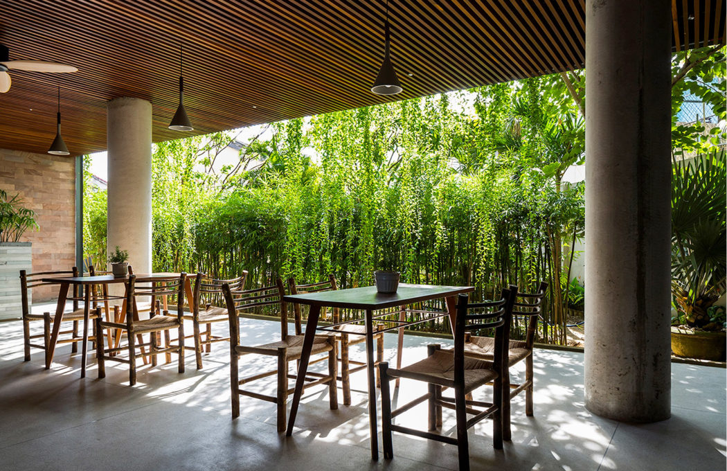 The green theme continues inside the hotel where the restaurant has a timber slatted ceiling strung with hanging plants, and bedrooms are surrounded by foliage that creates privacy screens.