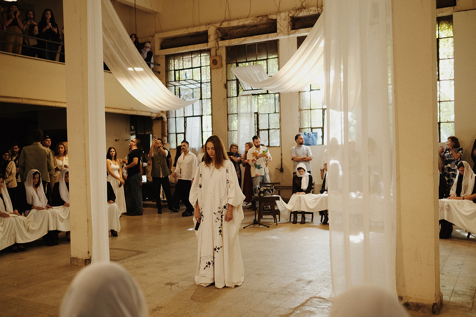 Fashion designer Salim Azzam‘s moving performance An Embroidered Dream was a tribute to the needlework traditions of Mount Lebanon. Throughout the installation, female artisans joined singer Lynn Adib in chanting a dreamlike lullaby composed by Wassim Bou Malham. The factory’s industrial walls were softened by draped silk to absorb the music.