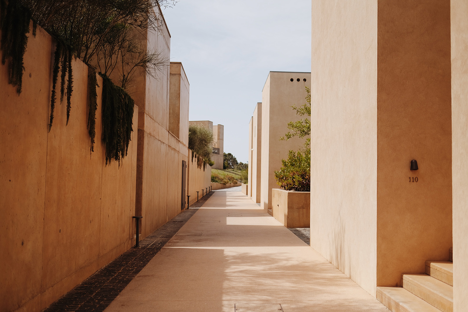 The 59-room resort revolves around a sequence of sandstone-hued concrete cubic towers, which house the suites, along with a central, elevated monolithic structure that sits atop the highest point, overlooking the rugged landscape of the park and the plunge pool. Clusters of private villas scatter throughout the estate.