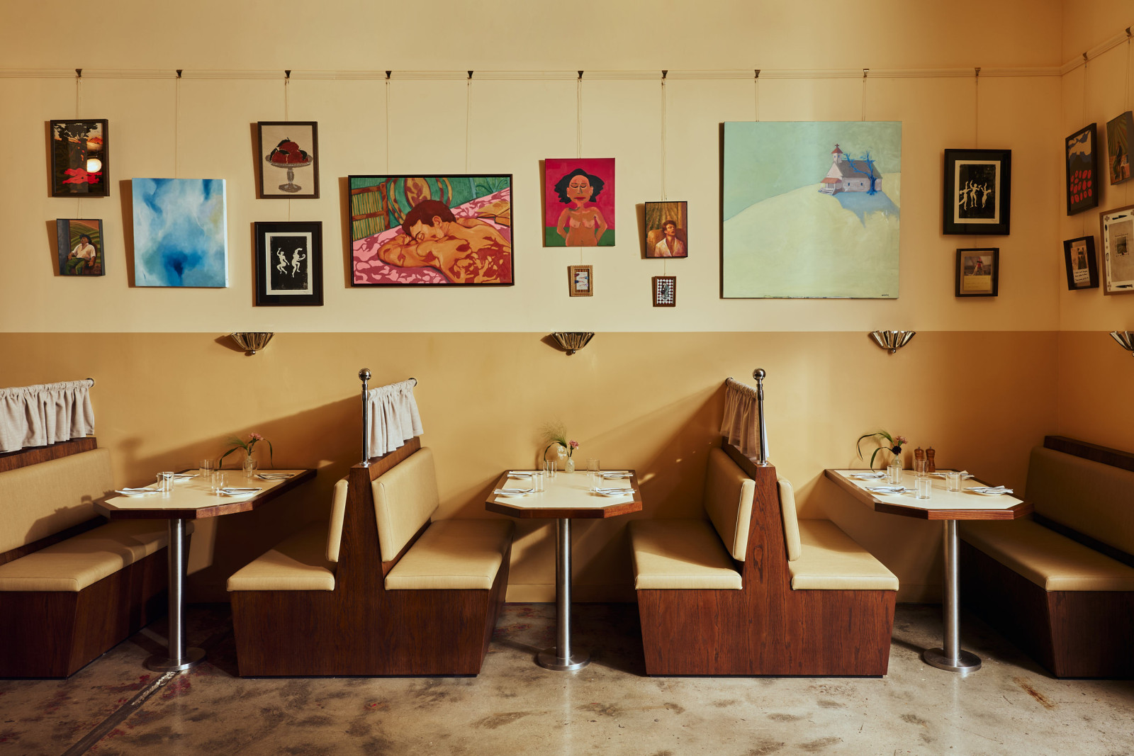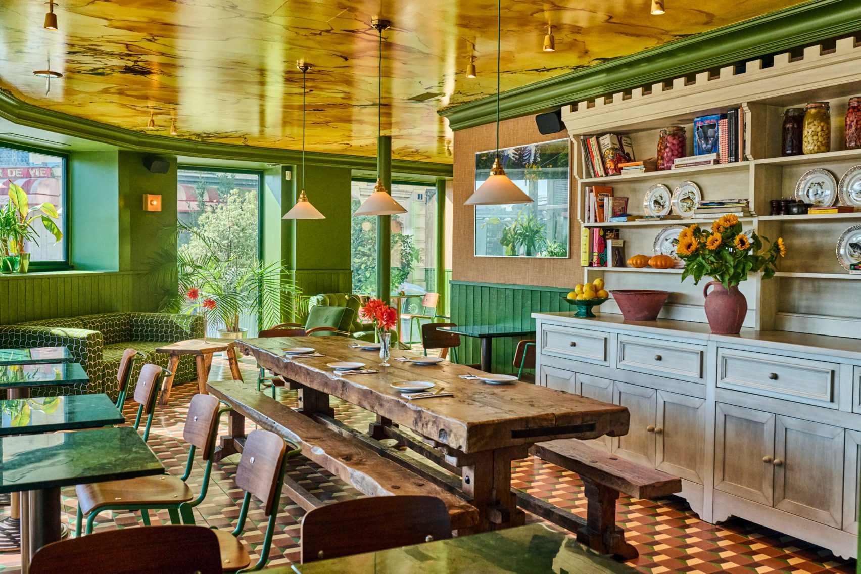 British extravagance mingles with French flair at the new Deux Gares Express, located in the 10th arrondissement. The in-house restaurant for Hotel Les Deux Gares, it’s designed by maximalist tastemaker Luke Edward Hall, who also crafted the hotel’s theatrical guest rooms. Nostalgic ’60s and ’70s colour is the protagonist in his kaleidoscopic scheme. Pops of yellow and green complement antiques like the large refectory table sourced from a French monastery, and custom joinery, like a dresser filled with board games, books and pottery. The food, as compelling as the design, is by Jonathan Schweizer and Frédéric Lesire and focuses on classic French favourites.