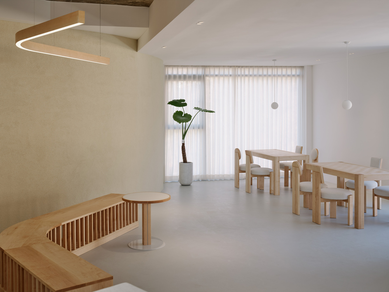 Coffee-lovers and architecture buffs overlap at this Andong-si café designed by KKOL Studio. The four-storey wave-shaped structure contrasts raw concrete with maple hardwood for warmth, enhanced by abundant daylight flooding in through towering windows. What sets this café apart is its multifunctional layout: a fruit market on the first floor, offices on the second and lounge areas the third and fourth levels.