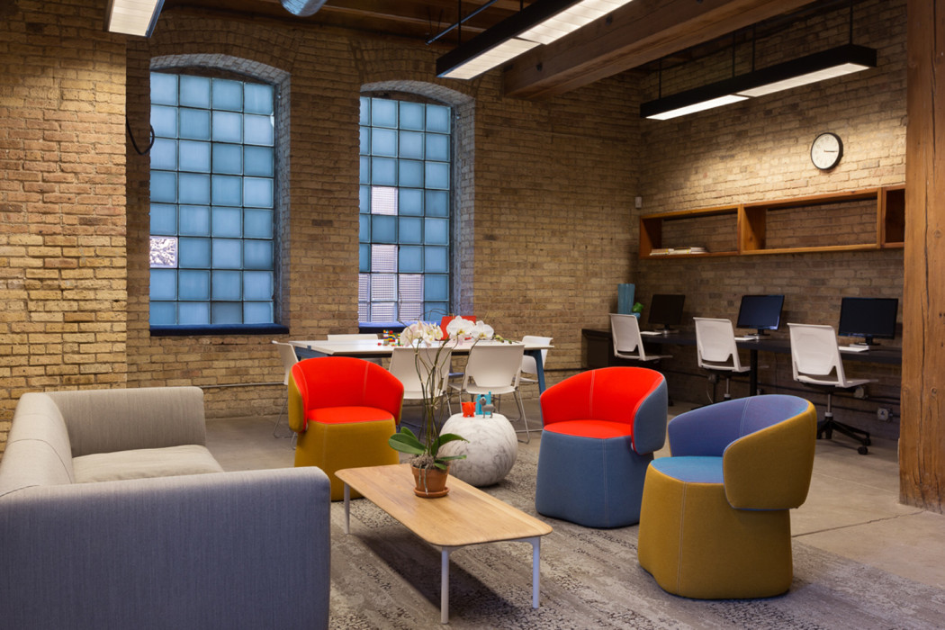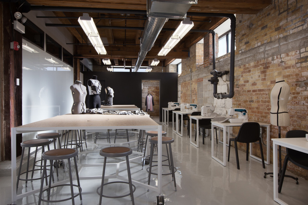 Inside, poured concrete floors, white and grey partitions, workstations, and high-gloss surfaces mingle with brick masonry and Douglas fir beams. A floating glass and steel staircase bores between the first and second levels.