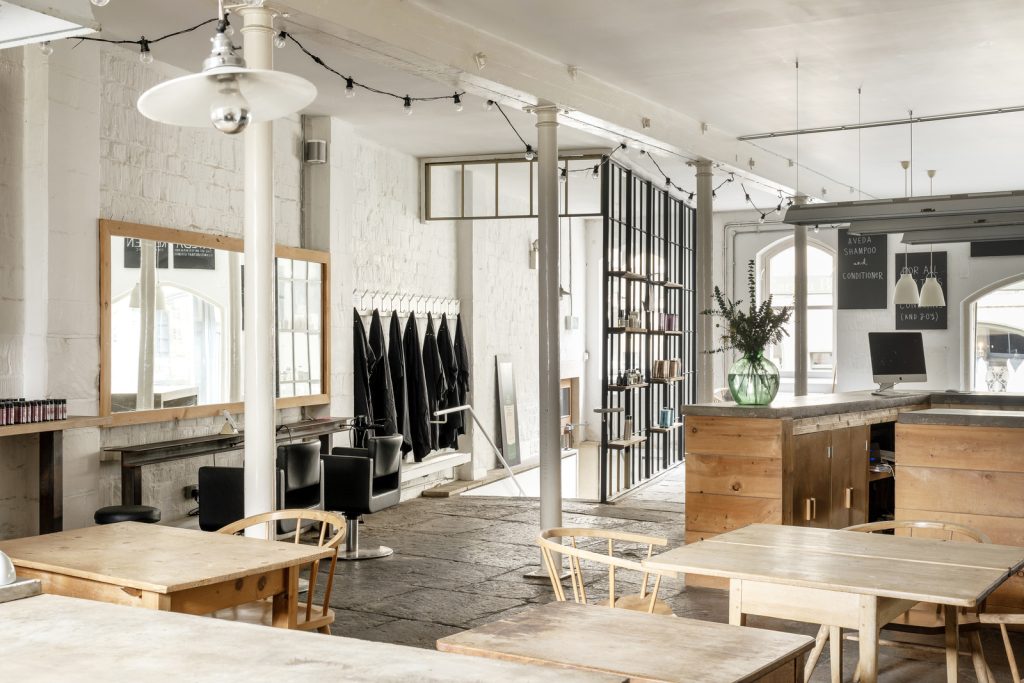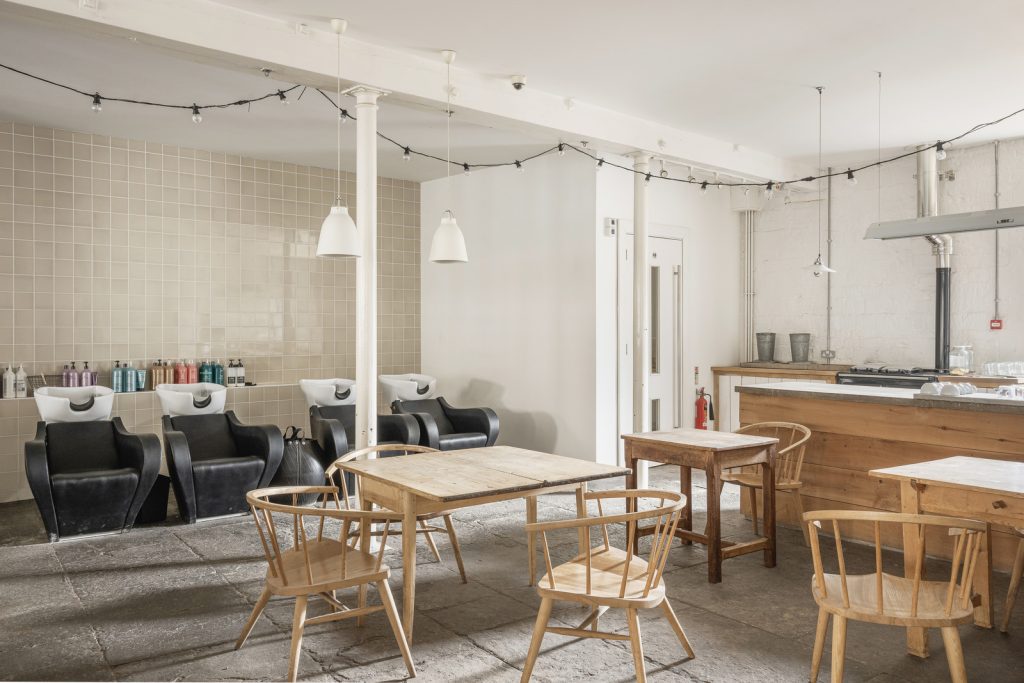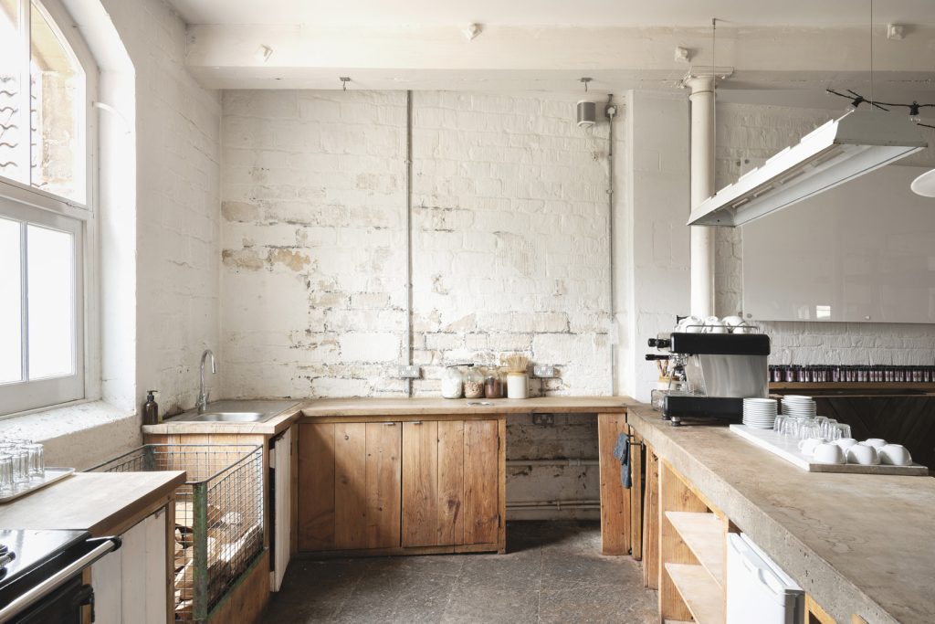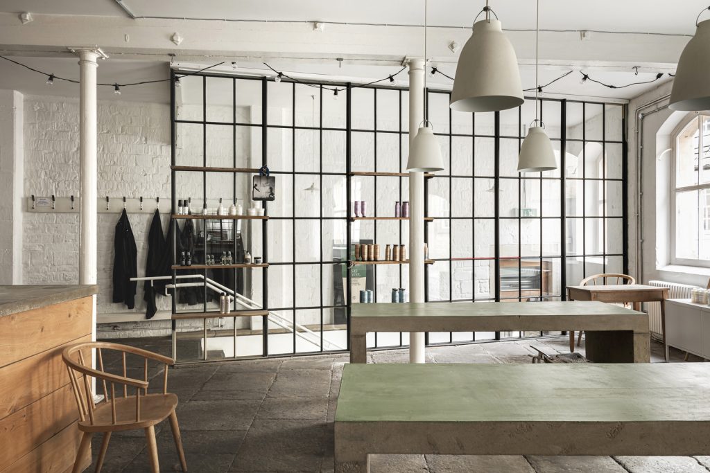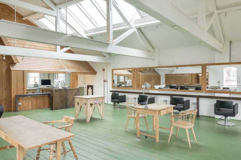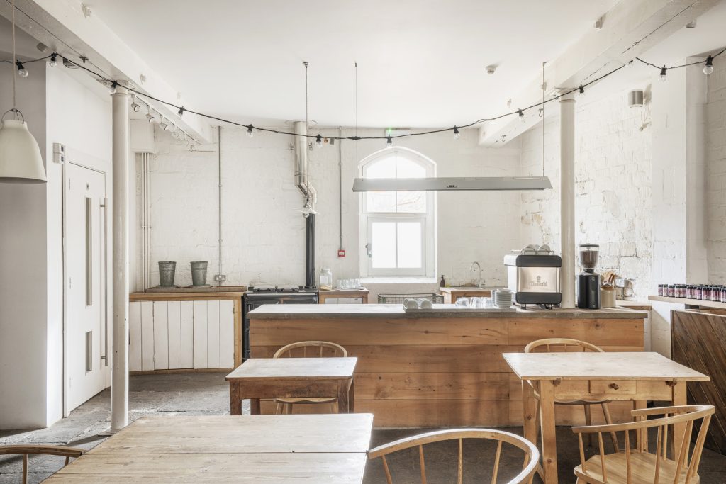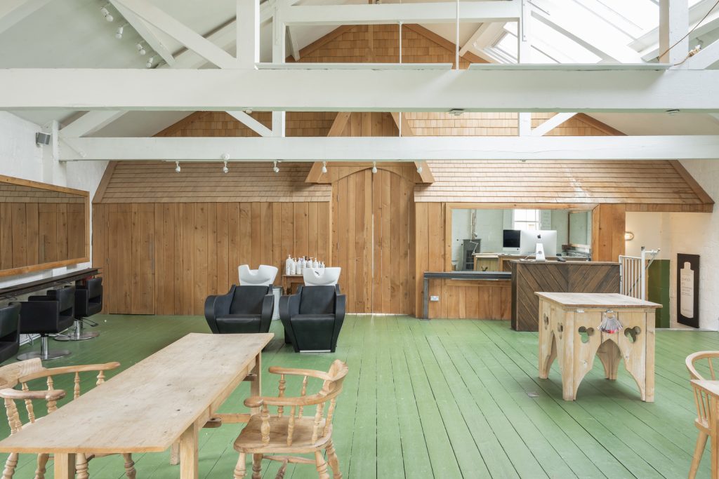 The ground level is almost entirely open plan, supported by a disciplined grid of cast-iron columns from its days as an ale and porter store. Flagstones, worn smooth over time, run the length of the floor where a cast-concrete service island and a horseshoe kitchen mark the building’s current café-led configuration. A stair enclosed in Crittall-style glazing leads to the first floor, where vaulted ceilings and parallel roof lights create a luminous, loft-like plate. Painted timber boards lend a soft green undercurrent, while a timber-clad volume at one end hides a series of enclosed rooms. A further staircase rises to a loft within the eaves, currently used for storage.