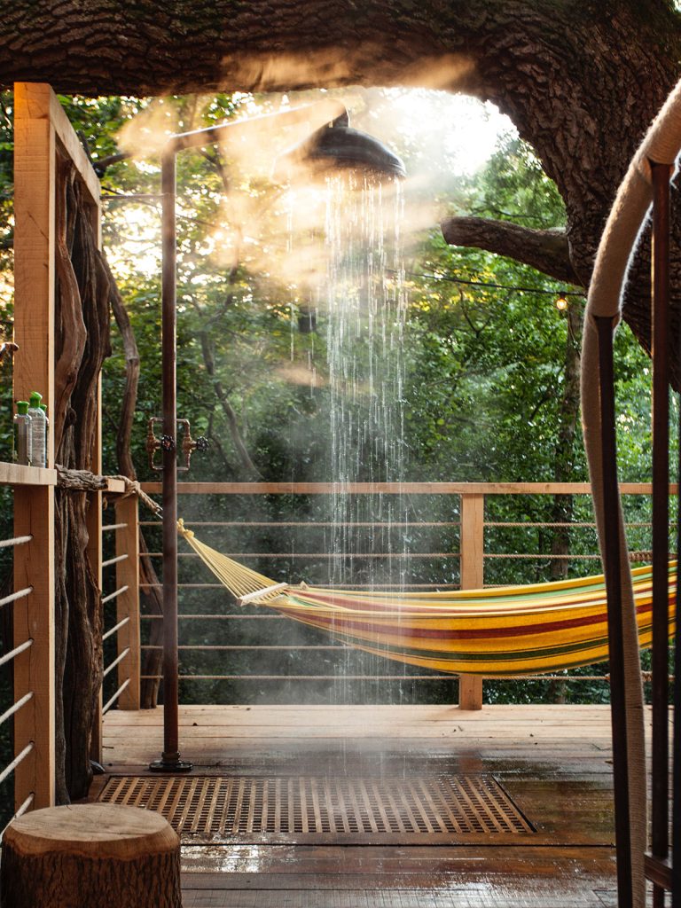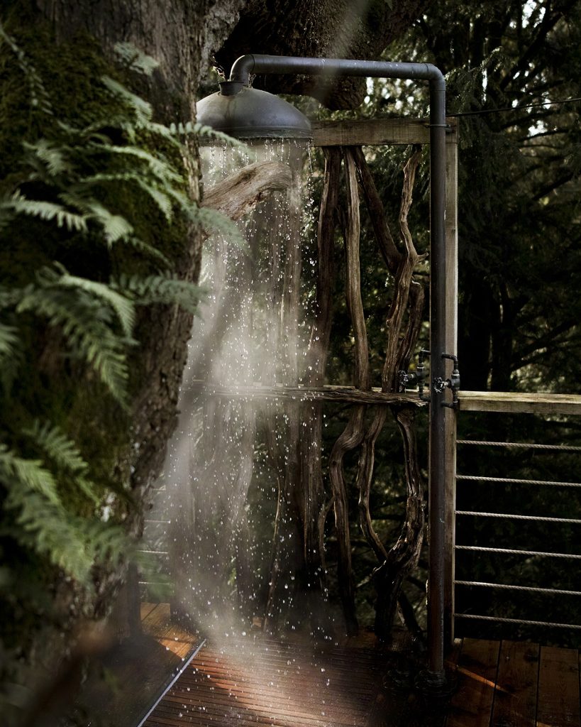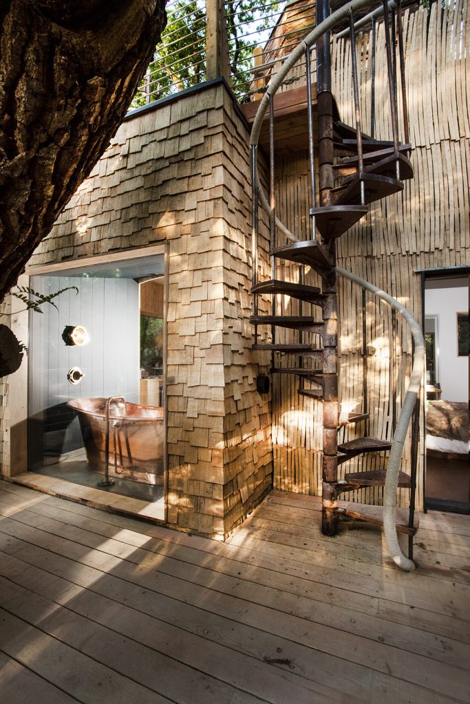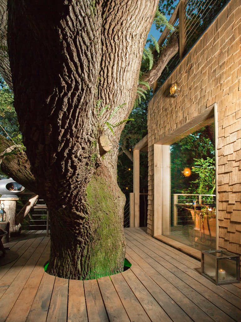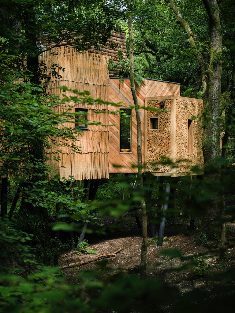Each treehouse has been carefully constructed — reclaimed telegraph poles, coppiced sweet chestnut and timber boardwalks shape a network of spaces that feel both deliberate and restrained. Interiors are compact but considered, opening outward to filtered light, views across the Axe Valley and a landscape managed for biodiversity. Alongside the RIBA awards, the approach has earned a Visit England Gold accolade and ROSE award.