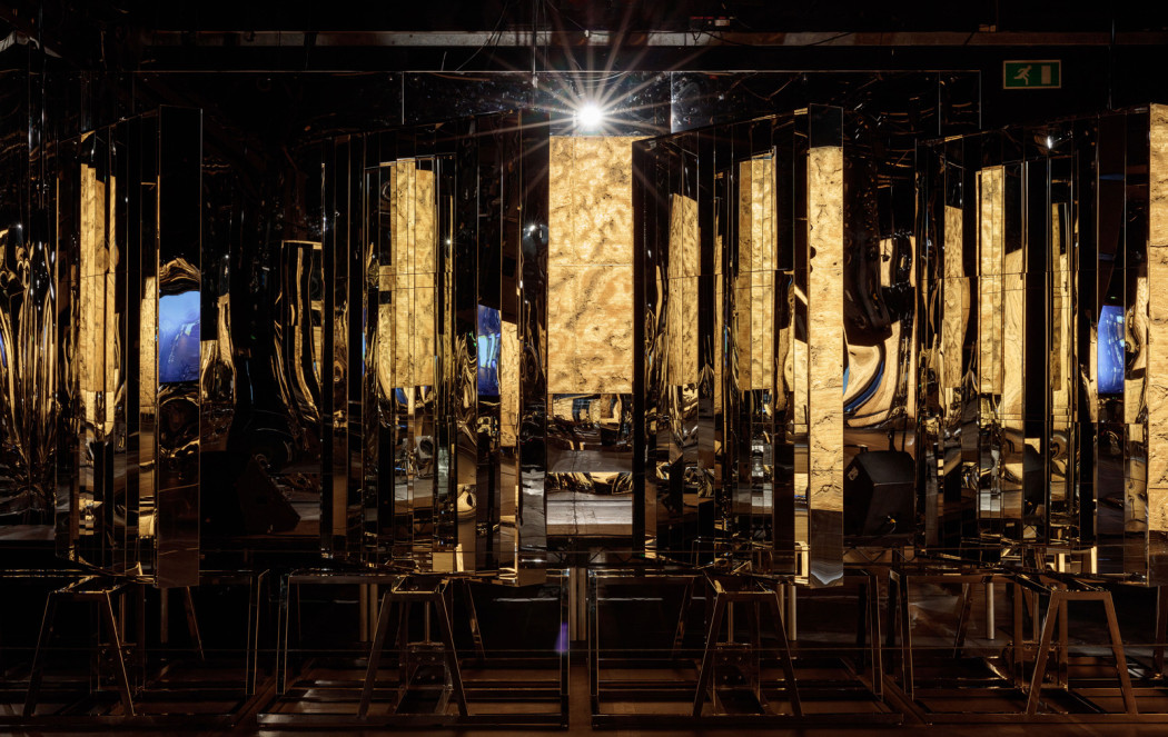 As flashily seductive as a disco-era nightclub set, the installation is open to daytime visitors as an art installation, and will be animated in the evenings by musical performances. Programmed by NTS radio in collaboration with the artist, each show will see two bands negotiate the challenges of playing face to face, separated only by a small audience and a rank of rotating mirrored panels at the front of each stage.